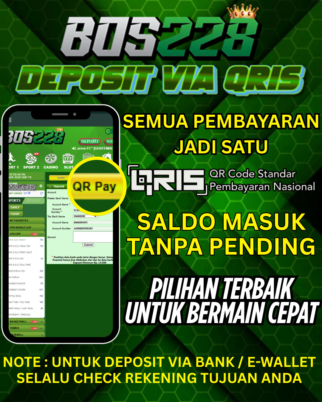 Untuk kenyamanan maksimal bagi member kami , kami sebagai Situs Slot Online terbaik menyediakan layanan deposit dan withdraw via bank lokal Indonesia. Kami juga menyediakan layanan deposit via E-Wallet, Dana maupun Pulsa sehingga memudahkan member kami untuk melakukan deposit dan bermain di Bandar Bola Terpercaya BOS228.